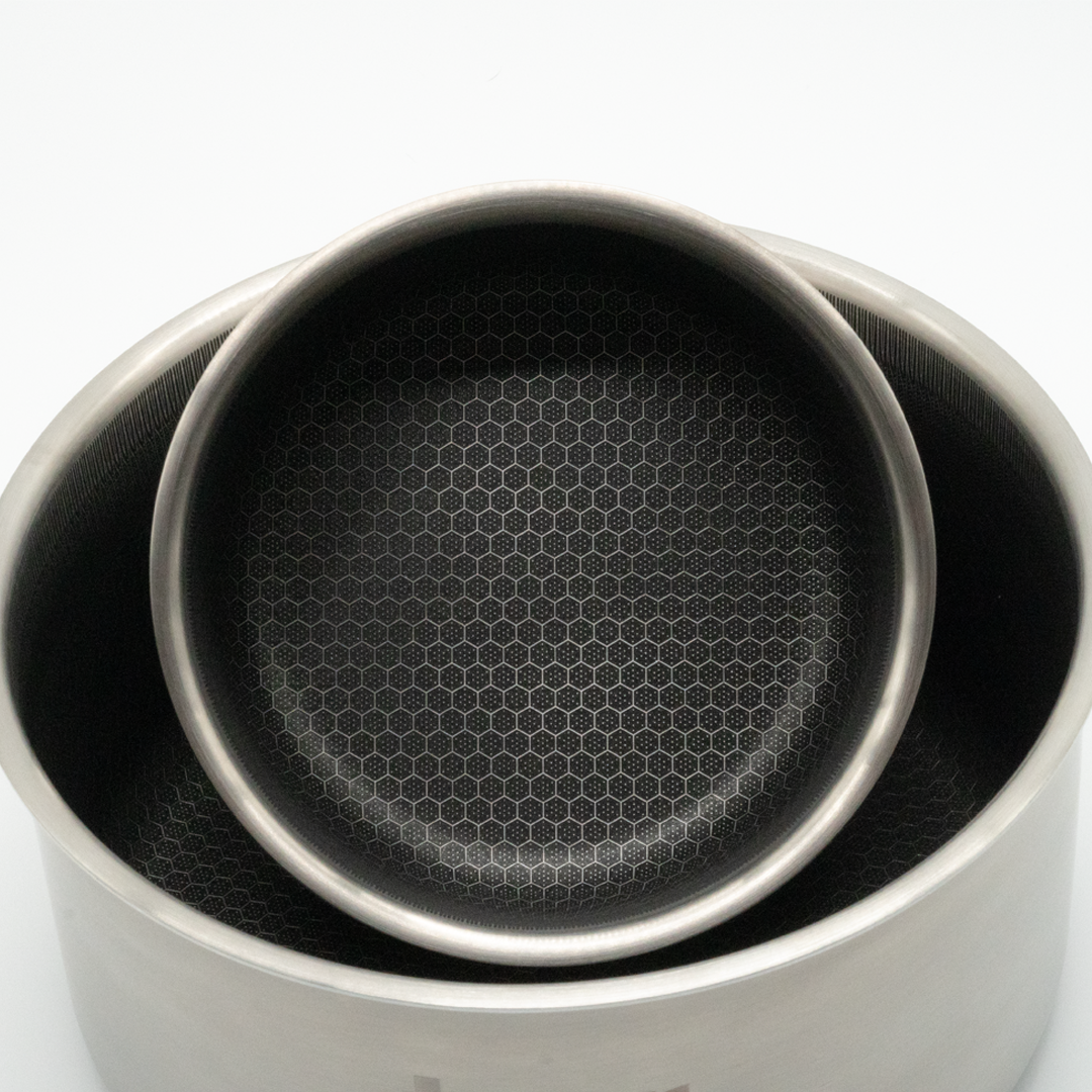 3-ply 304 stainless steel with hybrid honeycomb and non-stick coating cooking surface.
