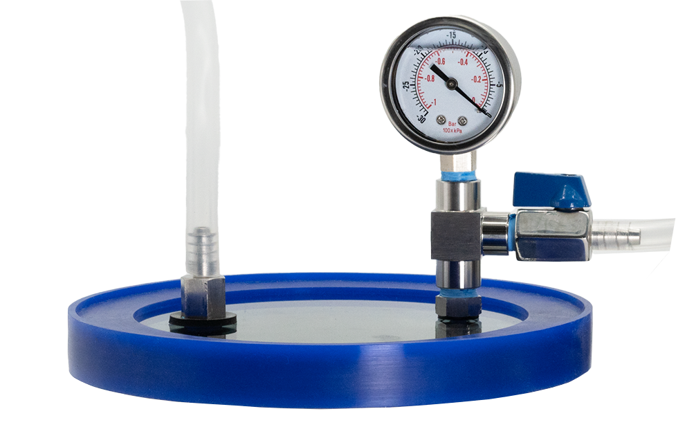 Two-Gauge Base Set includes three-way gauge and ball valve assemblies on both lids. The loading vessel set, torr-nado ladder condenser, and recovery vessel set components of the Torr Kitchen Vacuum Still. The components can be used together as an ethanol recovery system, in combinations as vacuum chambers, or individually in the kitchen or lab.