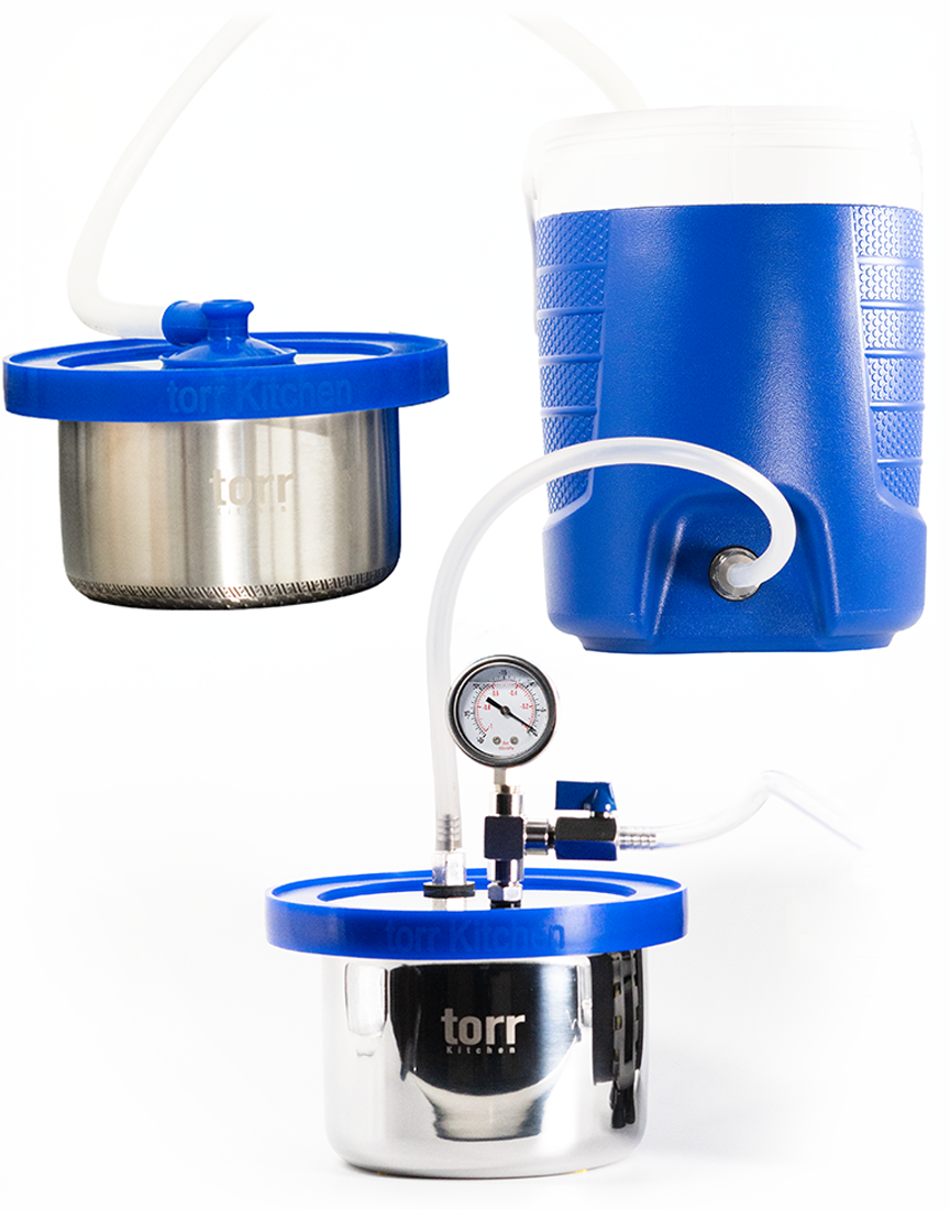The set includes the Flow Port loading vessel set, Torr-nado Ladder Condenser, and recovery vessel set components of the Torr Kitchen Vacuum Still. The components can be used together as an ethanol recovery system, in combinations as vacuum chambers, or individually in the kitchen or lab.